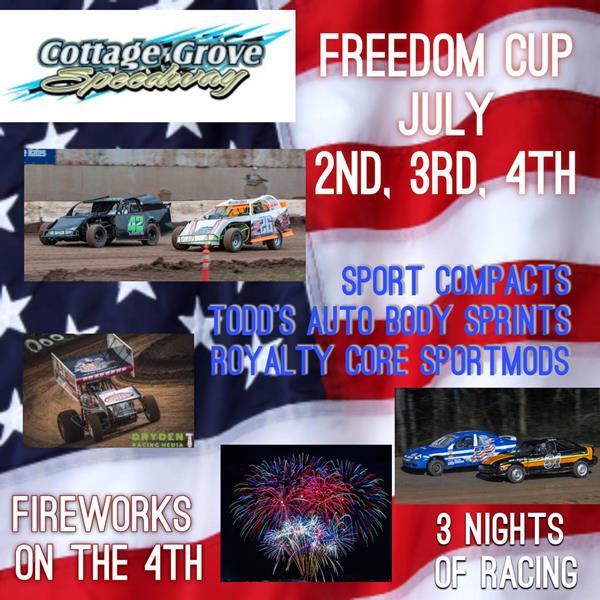 Monday night we will crown our 2022 Freedom Cup champions and then we will cap the weekend off with a HUGE fireworks show!  Cottage Grove Speedway is always the place to be for great racing and fireworks to celebrate our Freedom, and this year will be no different so be sure to plan on being here for the 4th of July and the 2nd and 3rd too!!