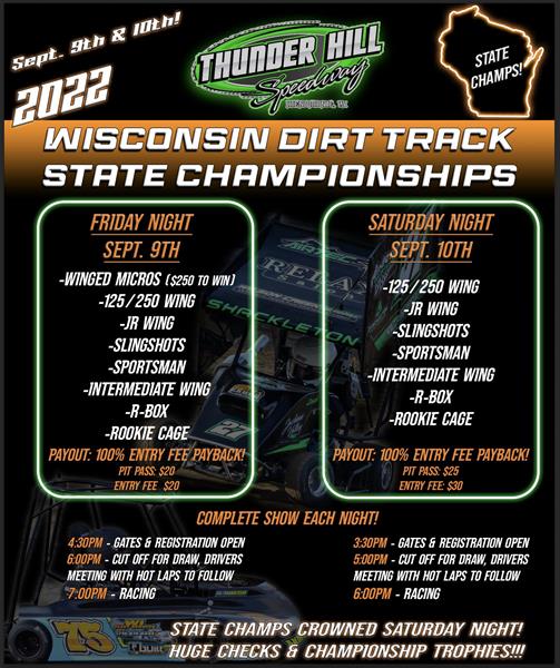 The 2022 Wisconsin Dirt Track State Championships are quickly approaching! Mark your calendars for Friday, September 9th and Saturday, September 10th. Come join us to watch the best in the state compete for the title!