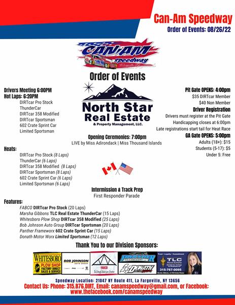 Pit Gates open at 4:00pm with General Admission gates opening at 5:00pm. The drivers meeting will take place at 6:00pm sharp with Hot Laps to ensue at 6:20pm. Opening Ceremonies for the evening will kick off at 7:00pm by the lovely Miss Adirondack/Miss Thousand Islands and Heat Races will immediately follow.