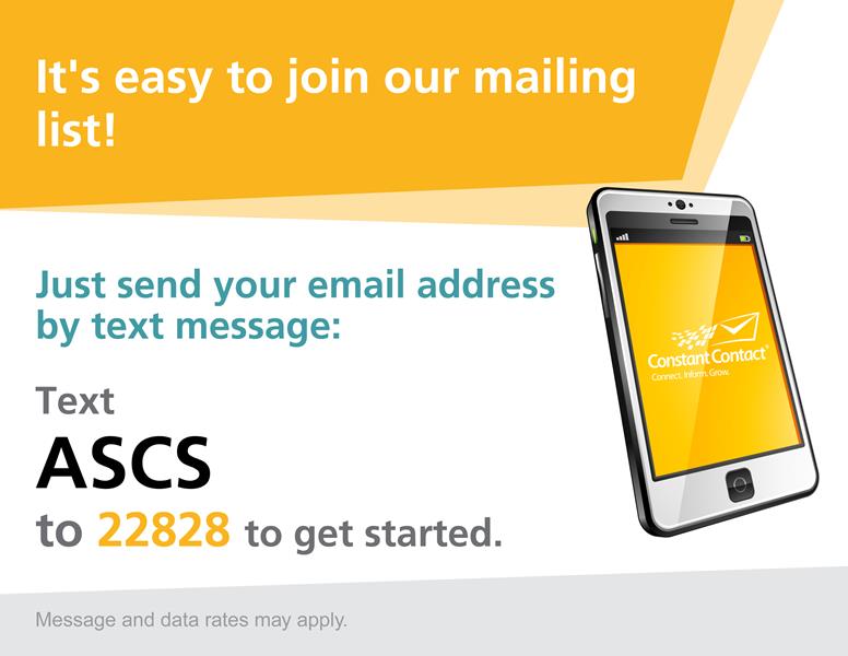 Sign up for the ASCS E-News Letter today at http://visitor.r20.constantcontact.com/d.jsp?llr=7geq9ykab&p=oi&m=1111082143964
