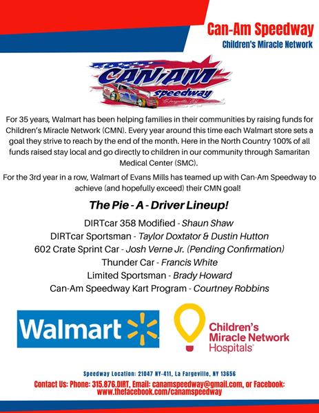 A special night is planned for Friday night at Can-Am Speedway in LaFargeville, New York. For 35 years, Walmart has been helping families in their communities by raising funds for Children’s Miracle Network (CMN). Every year around this time each Walmart store sets a goal they strive to reach by the end of the month. Here in the North Country 100% of all funds raised stay local and go directly to children in our community through Samaritan Medical Center (SMC).