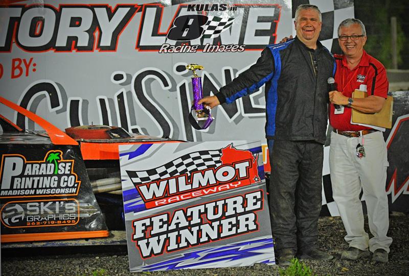 Eagle's Steve Mueller captured his second consecutive 20-lap Modified feature win at Wilmot, also having won Memorial Day weekend. Mueller held the lead from the first caution two laps into the main. Two additional yellows slowed the progress in the early going and then a red flew when Elkhorn's Jason Wirth flipped coming out of turn four, bouncing off the restraining grandstand fence, landing upside down in the middle of the track. The safety team worked to right the car and assist J. Wirth as he was able to walk to the ambulance to get checked out.