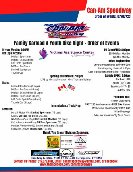 This week it’s Family Car Load night so load up the car and bring everyone in the house to Can-Am Friday night. The Whitesboro Plow Shop DIRTCar 358 Modified, Bob Johnson Auto Group DIRTCar Sportsman, Donath Motorworx Limited Sportsman, Panther Frameworx 602 Crate Sprints, Sundance Leisure Thunder Cars and FABCO DIRTCar Pro Stocks will all be there for a full card of racing.