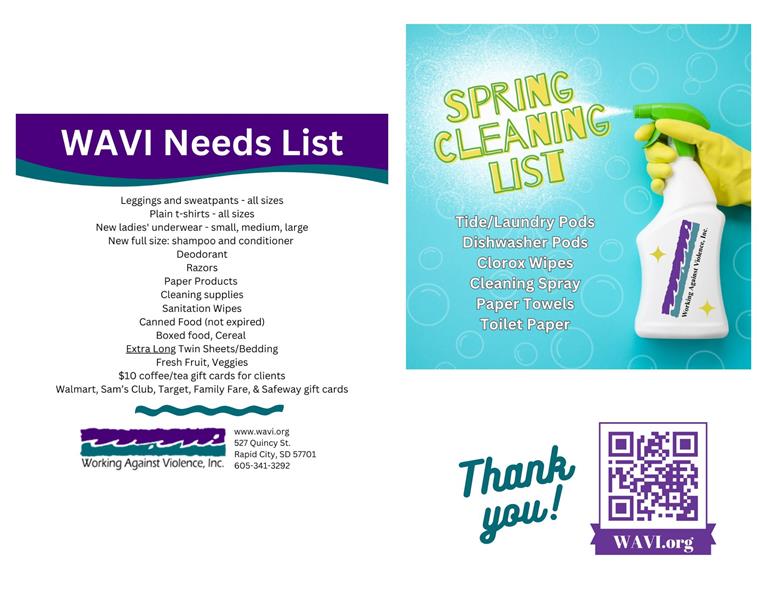 Please bring donations for WAVI (Working Against Violence Inc.) of Rapid City! They are in need of: Leggings and sweatpants - all sizes, Plain t-shirts - all sizes, new ladies underwear S,M,L, Clorox wipes. women's hygiene products, razors, disposable cleaning gloves, shampoo/conditioner full size, deodorant, disinfectant spray, non perishable food (not expired) boxed food, cereal, $10 coffee/ tea gift cards from Walmart, Sam's club, target, Family Fare + Safeway.