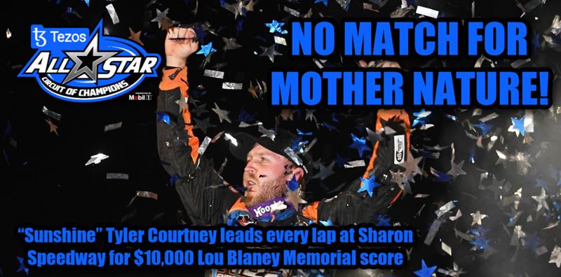HARTFORD, Ohio (July 9, 2023) - Mother Nature may have done her best to ruin Sharon Speedway’s 15th Annual Lou Blaney Memorial on Saturday evening, July 8, but not even her persistence could keep the “Sunshine” from dominating action, as Clauson Marshall Racing’s own Tyler Courtney was the eventual $10,000 winner, leading every circuit of the 35-lap contest to clinch his first-ever Tezos All Star Circuit of Champions presented by Mobil 1 main event victory at the eastern Ohio staple.