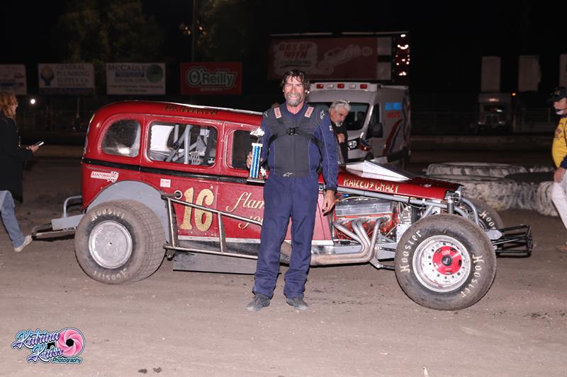 Joel Hannagan wrapped up the championship with his seventh 20 lap Hardtop win of the year aboard the Doug Braudrick owned Junkyard Dog. The race was restarted a couple of times with Brad Coello of Oakley eliminated early on. Mike Gillard of Atwater set the early pace ahead of Hannagan, but a Turn 4 pass on Lap 2 put Hannagan into the lead. Mike Friesen of Atwater was an early third, but Rick Elliott of Merced made a Turn 4 pass on Lap 3 to claim the position. Elliott started getting pressure from Roger MacShain of Roseville before MacShain made the move into third on the ninth lap. Hannagan began to pull away and held a straightaway advantage over Gillard by the time the checkered flag flew. MacShain was the final lead lap finisher in third, followed by Elliott and Friesen.