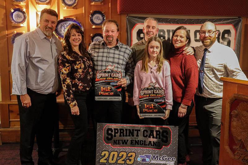 MEREDITH, N.H. (January 28, 2024) – An enthusiastic crowd officially brought the curtain down on the 2023 McGee Automotive Family Sprint Cars of New England (SCoNE) racing season on Saturday, January 27. The accomplishments of the tour’s top competitors were celebrated at the SCoNE Awards Banquet amid a party atmosphere at the Hart’s Turkey Farm Restaurant in Meredith, New Hampshire.