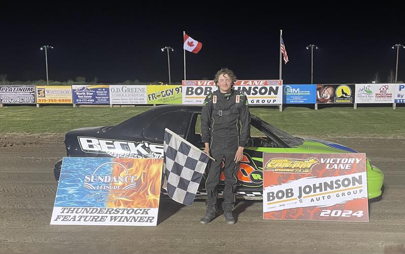 Former track champion Tony Frezzo led the 15 lap Sundance Leisure Thundercar feature with Damien Bechler and OJ White right there to challenge. On lap 4 Bechler would take over the top spot and had a fast car to stay in front. Meanwhile Francis White, who was celebrating his birthday on this night, was on the charge and got to the number two spot getting by Frezzo, then tried to run down Bechler for the lead. It appeared Bechler was going to hold Francis White at bay but the caution flew on lap 13. On the restart Bechler did what was needed to score the win, his first of the year. White crossed in second over Tony Frezzo, Michael Greenfield and Jared Gilson.