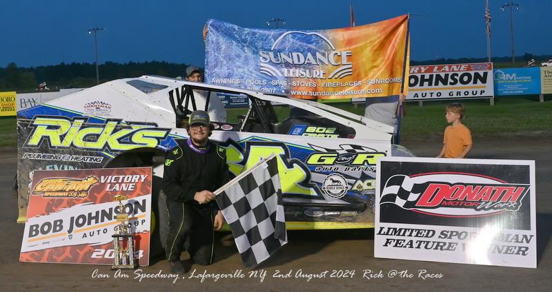The night began with the Donath Motorworx Limited Sportsman 12 lap feature and Brady Howard was the driver to beat as he took the lead from Gage Howard on lap 2 and began to drive away while Camdin Cook completed the top three. Brady Howard was setting a fast pace and looked to be well on his way to his 4th win of the year, while Cook did what he could do to run him down. On lap 10 the caution flew setting up a two lap sprit to the finish. On the restart Howard was able to get the lead away and would drive on to his 2nd win in a row and 4th of the year at Can-Am. Camdin Cook, Genavieve Bartlett, Gage Howard and Logan Brown completed the top 5.
