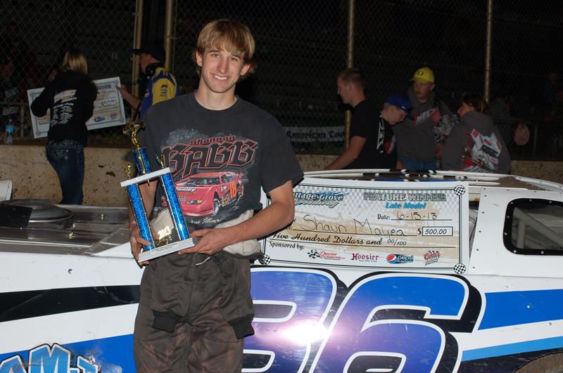 Begley was by far not out of the woods yet as he would receive considerable pressure from teammate Darin Crooks of Cottage Grove.  Crooks, in the #73 Nova, tried to find a route around Begley but was unable to make the pass.  In the later stages of the race Crooks had to keep challengers in check from trying to overtake his second place position which allowed Begley to build a little lead.  Despite a late race caution and an exciting finish Begley would hold on to the lead to earn the victory and become the fourth different winner this season in the division.
