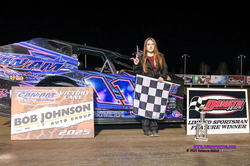 Fulton New York’s Richard Murtaugh and track regular Gavin Eisele brought the field of 30 starters to Mike LaClair’s green flag for the start of the 30 lap event and Murtaugh wasted not time showing how dominant he would be in the early laps. Murtaugh stretched his advantage out early by over three seconds with Eisele, Bobby Herrington, Savannah Laflair and Tyler Corcoran completing the top five early on. Murtaugh was cutting through lapped cars with no issue while behind him Tyler Corcoran was using the extreme outside lane to pick up spots, moving to the runner up position just past the halfway point, but had a long way to go to catch the leader. On lap 18 Corcoran got the break he wanted as Owen Nier slowed to a stop in turn four, bringing out the yellow. When the green flew Corcoran and Murtaugh put on a spectacular side by side battle, with each driver taking turns on the outside and inside lanes while Gavin Eisele, Bobby Herrington and Shane Pecore battled for the remaining positions in the top 5. Coming to the white flag, Corcoran was able to slip by Murtaugh in turn 4 and finally was able to pull away to record back to back season openers in the Bob Johnson Auto Group DIRTcar Sportsman division. Murtaugh once again was shut out of Can am victory lane coming home second with Gavin Eisele, defending North Region Champion Shane Pecore and Bobby Herrington completing the top 5.