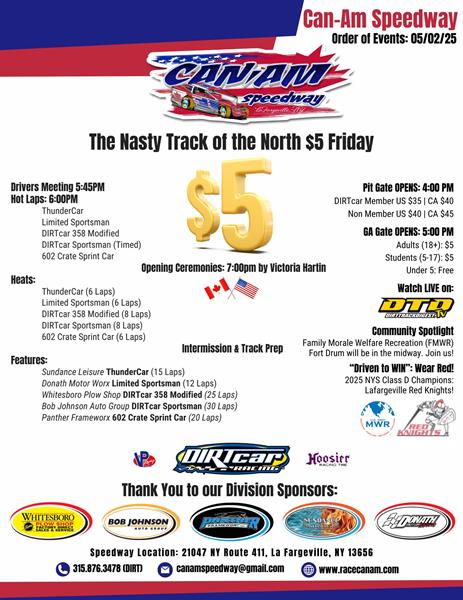 The 2025 Can-Am Speedway season continues TONGIHT in Lafargeville with $5 Friday, that’s right General Admission is just $5!