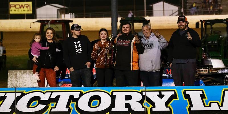 A Feature 1 (15 Laps): 1. 0-Dakota Girard[2]; 2. 8K-Tyler Knudtson[1]; 3. 17R-Logan Roark[3]; 4. 30-Trevor Wilson[4]; 5. 17-Garrett Parker[7]; 6. 51-Sean Henson[5]; 7. 7C-Derek Cook[11]; 8. 25J-Ryan Hargus[8]; 9. 100-TRACY Melloway[9]; 10. 15R-Oakley Ragland[12]; 11. 55-Adriell Shepherd[10]; 12. 33K-Kahne Groves[6].