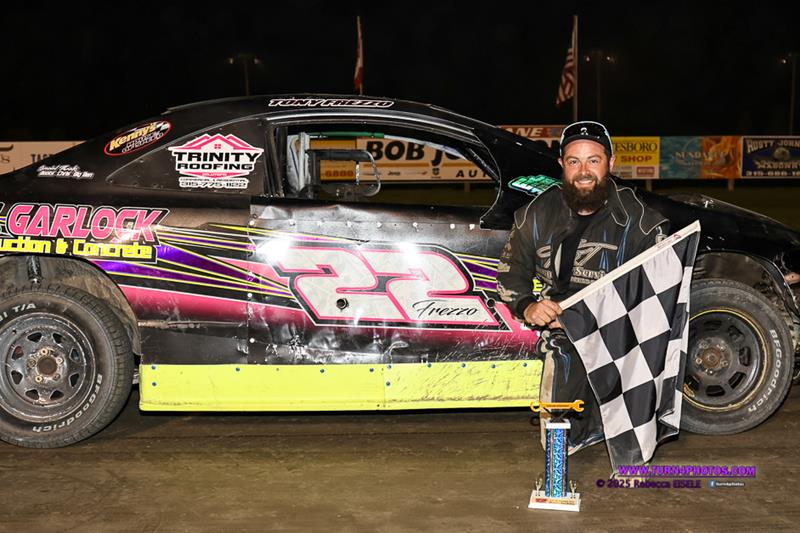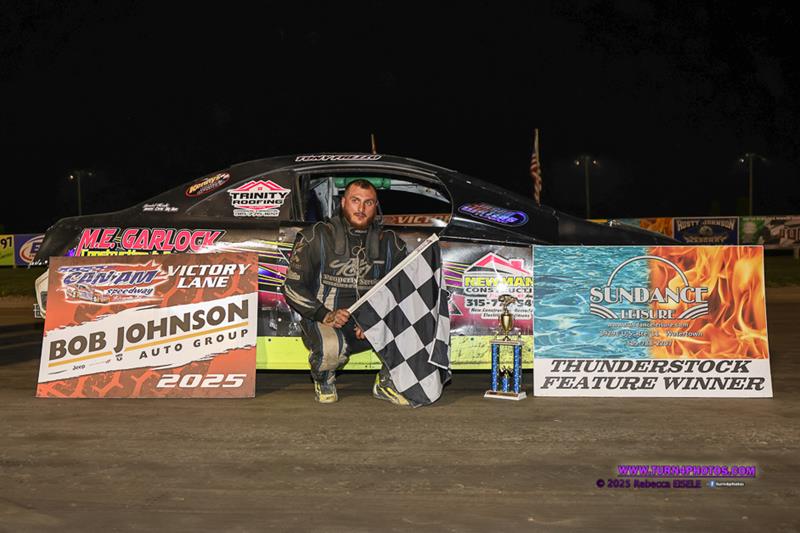 Tony Frezzo has had some rough luck to start 2025 in the Sundance Leisure Thundercars but would grab the lead early in the 15 lap event with last weeks winner Mike Greenfield giving chase. A scary moment on lap 2 for Greenfield as a big ball of fire came out of his ride in turn 3 and 4, resulting in a red flag on the track. The fire went out and Greenfield climbed out quickly as track safety crews extinguished the flames within a matter of seconds, Greenfield was not hurt in the incident. Tony Frezzo continued his great driver and it appeared he was headed for victory with David Rasmussen and Francis White closing quickly. That all changed on lap 9 as Rasmussen blew a tire and spun on the front stretch, nearly hitting the wall. When the green flew Corey Valade and Anthony St. Mary Jr. would challenge the race leader but Frezzo remained up front and in control. Despite an intense battle for the runner up spot in the final laps, Tony Frezzo would hold on and score his 13th career Can Am Thundercar win with Corey Valade and Anthony St. Mary Jr. crossing in the top three while Francis White rallied back to finish 4th and Collin Bauter completed the top 5.