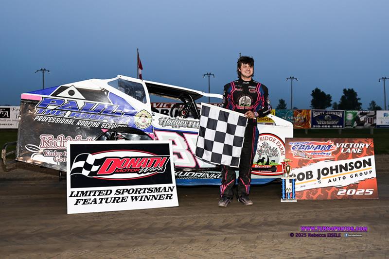 Patrick Kudrinko was very close to not making the night of racing but managed to get to the track just in time and he made it pay off with a great start to the Donath Motor Worx 12 lap Limited Sportsman feature. Kudrinko led early with Caleb Howard and Mason Rogers chasing him. At the halfway point Kudrinko continued to lead but Caleb Howard was right there to challenge as Rogers, Brianna Murtaugh and 3 time winner Genavieve Bartlett remained within striking distance. As the laps wound down Howard did all he could to get by for the lead, but it was not meant to be. In the end, Patrick Kudrinko would hold on, lead every lap and record his first ever Can Am win and second win of his career. Caleb Howard, Mason Rogers, Brianna Murtaugh and Genavieve Bartlett completed the top 5.