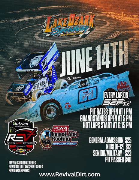 Following a weekend in Western Kansas, the Nutrien Ag Solutions POWRi REVIVAL Super Dirt Series, presented by Sunoco and Start2Finish, is excited for a day at the Lake. We're referring to Lake Ozark Speedway. REVIVAL will partner with the POWRi Honest Abe Roofing 410 Outlaw Sprints for an exciting night of racing on Saturday, June 14th. This will be one of three nights this season where these two series will compete on the same track. The other two events will be held at Texas Motor Speedway Dirt Track for the season finales.