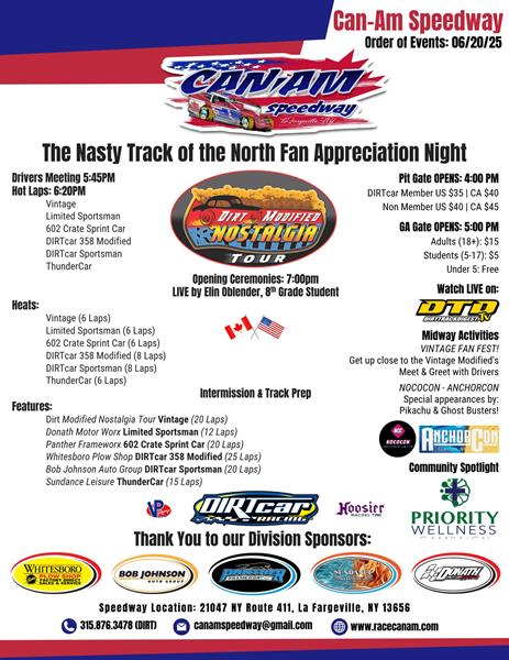 The 2025 Can-Am Speedway continues TONIGHT, Friday, June 20th in Lafargeville with our Fan Appreciation Night. Whether you're a die-hard fan or a first-time visitor, there's never been a better time to join us!