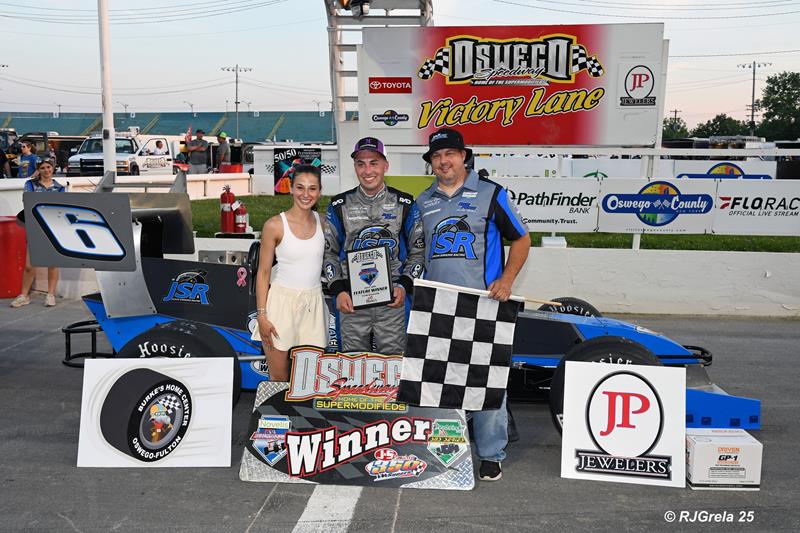 OSWEGO, NY (July 6, 2025) - Fulton’s Josh Sokolic made Oswego Speedway history Saturday night, collecting his first career Novelis Supermodified feature win in just his third regular season start behind the wheel of the Jason Simmons Racing No. 6. Sokolic led all 40 laps of the first Twin 40 feature after starting on the front row alongside Lou LeVea Jr., maintaining control throughout despite heavy lapped traffic and pulling away from Otto Sitterly and Jeff Abold in the closing stages.