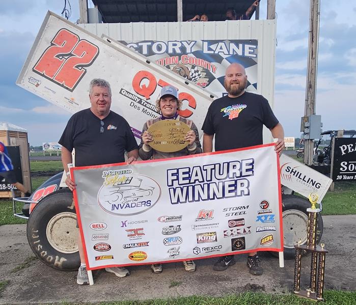 Vinton, IA, July 6, 2025 – Riley Goodno became the fifth different leader late in the going and captured his second career feature win with the Mohrfeld Solar Sprint Invaders Sunday night at the Benton County Speedway in Vinton, Iowa. The action packed main event not only saw five leaders, but many changes in position in the top five throughout. It was the Knoxville, Iowa native’s first win with the series since a 2022 triumph at Eldon Raceway in Eldon, Iowa, and earned him $2,000 aboard the Goodno Promotions #22.