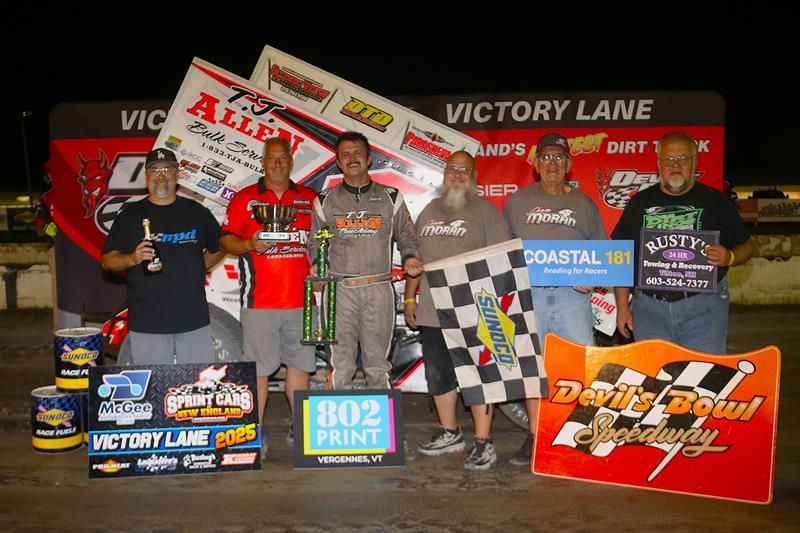 WEST HAVEN, Vermont (July 14, 2025) – It has become obvious that Chase Moran has two settings – “Sleep” and “Go” – and his eyes were wide open at Devil’s Bowl Speedway. The 21-year-old rising star turned in the performance of his young career in the McGee Automotive Family Sprint Cars of New England Tour (SCoNE) event at the Vermont track on Saturday, July 12, earning his first win of the season in a jaw-dropping drive that brought fans to their feet.