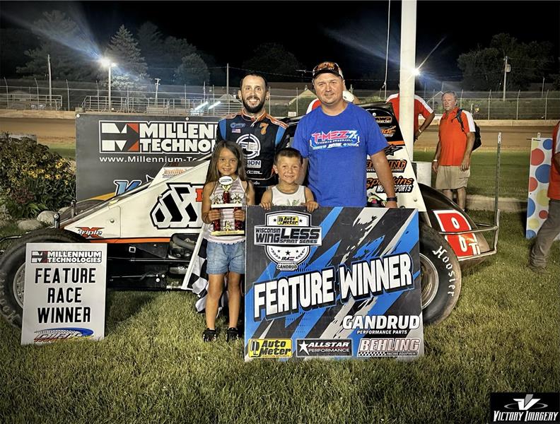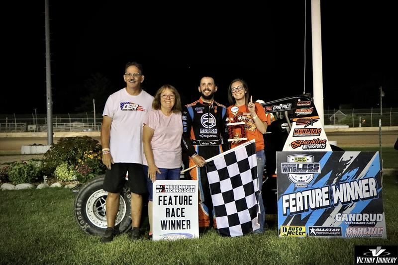 (Plymouth, Wis., Saturday, July 26, 2025)--Adam Taylor of Wheatfield, IN captured his second AutoMeter powered by Gandrud Performance Wisconsin WingLESS 20-lap feature of the season in as many starts at Plymouth Dirt Track on the Sheboygan County Fairgrounds on Saturday, July 26, 2025.