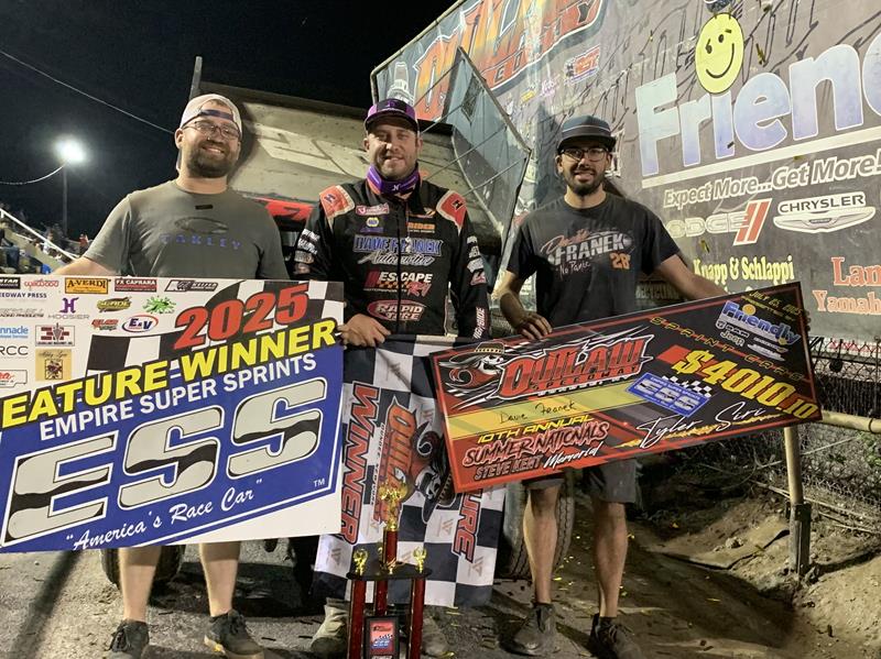 By Curtis Berleue (Dundee, NY) | For the second time in two years, Davie Franek picked up a $4,000 victory at the Outlaw Speedway on Friday night. Last years Outlaw Fall Nationals winner once again found victory lane at the Dundee oval, this time leading every lap in a non-stop feature in the Outlaw Summer Nationals worth $4,000.