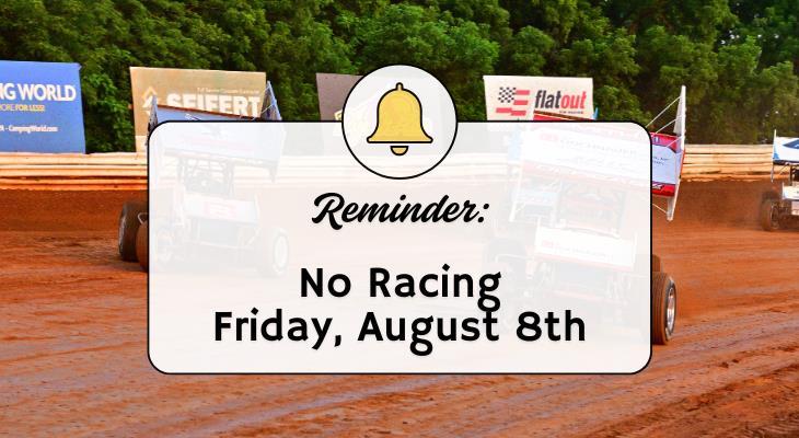 Mechanicsburg – There will be no racing at Williams Grove Speedway on August 8 before the speedway returns to action with a big program of sprint car racing on Friday night, August 15 at 7:30 pm.