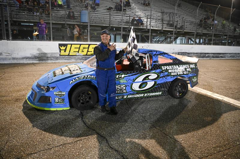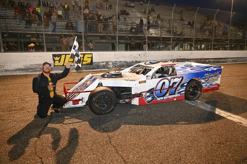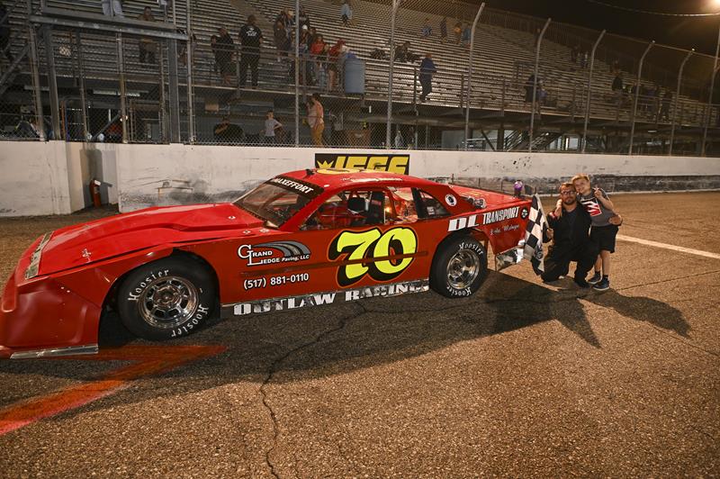 Pat Dent won both the heat and the feature clinching FEATURE WIN #5 ON THE SEASON! Here is the full results behind Dent for the heat: 2nd 91-Gord Alblas; 3rd 42M-Dennis Motes; 4th 57-Randy Kretzinger Jr; 5th 98N-Jacob Newman; 6th 49-Caleb Sattler; 7th 33-Todd Miller; 8th Did Not Start 79M-Nick Murdock and feature: 2nd 57-Randy Kretzinger Jr; 3rd 98N-Jacob Newman; 4th 33-Todd Miller; 5th 42M-Dennis Motes; 6th 49-Caleb Sattler; 7th Did Not Finish 91-Gord Alblas; 8th Did Not Finish 79M-Nick Murdock.
