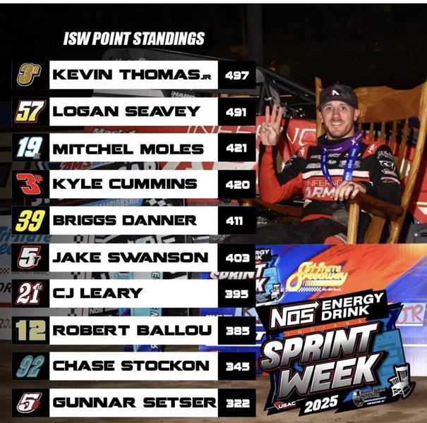 USAC NOS ENERGY DRINK INDIANA SPRINT WEEK PRESENTED BY HONEST ABE ROOFING POINTS: 1-Kevin Thomas Jr.-337, 2-Logan Seavey-335, 3-Briggs Danner-331, 4-Robert Ballou-306, 5-Mitchel Moles-295, 6-Jake Swanson-292, 7-Kyle Cummins-283, 8-C.J. Leary-278, 9-Gunnar Setser-254, 10-Chase Stockon-250.