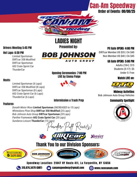 The 2025 Can-Am Speedway continues TONIGHT, Friday, August 8th in Lafargeville with Ladies Night presented by Bob Johnson Auto Group. Whether you're a die-hard fan or a first-time visitor, there's never been a better time to join us!