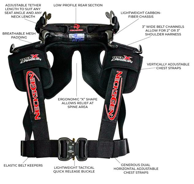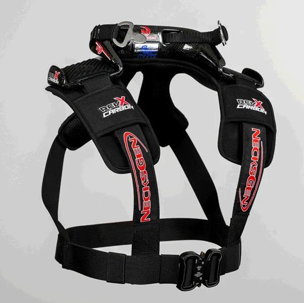 The REV X Carbon is NecksGen's newest head and neck restraint / frontal head restraint. Hand made from carbon fiber and lightweight materials, the new REV X adds an extra element to driver comfort. The X strap system holds the device securely in place while driving, and also helps keep it where you want it while getting in or out of the vehicle. The straps are easily adjustable to make personal fitment easy, and the double adjustable tactical buckle in front is easy to use. The vertical chest straps have some adjustment to fit men and women both easily.
