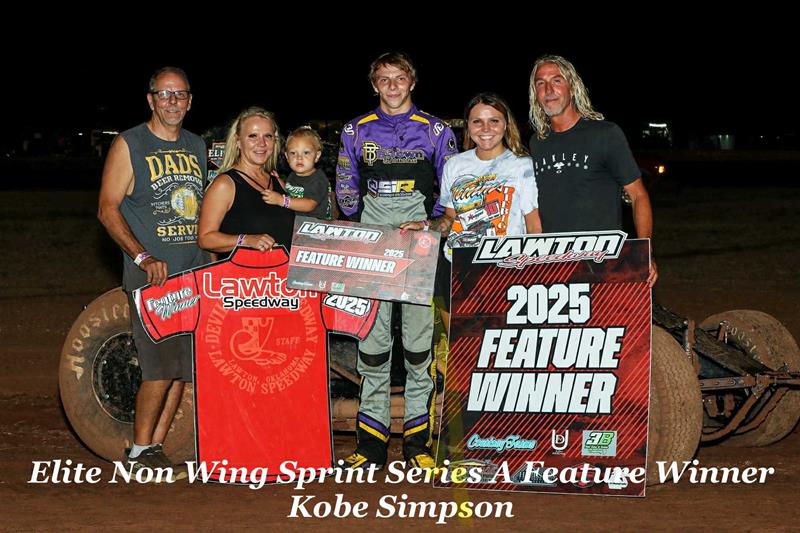 Earning his first career-sanctioned victory in the POWRi Elite Non-Wing Sprint Series, Kobe Simpson would fly from starting sixth to capture the feature win. Speedy Cooper Sullivan would clinch third as Steven Shebester finished fourth with Paul White rounding out the top-five finishers for the POWRi Elite Non-Wing Sprint Series presented by DIRT X Ind. feature event at Lawton Speedway.