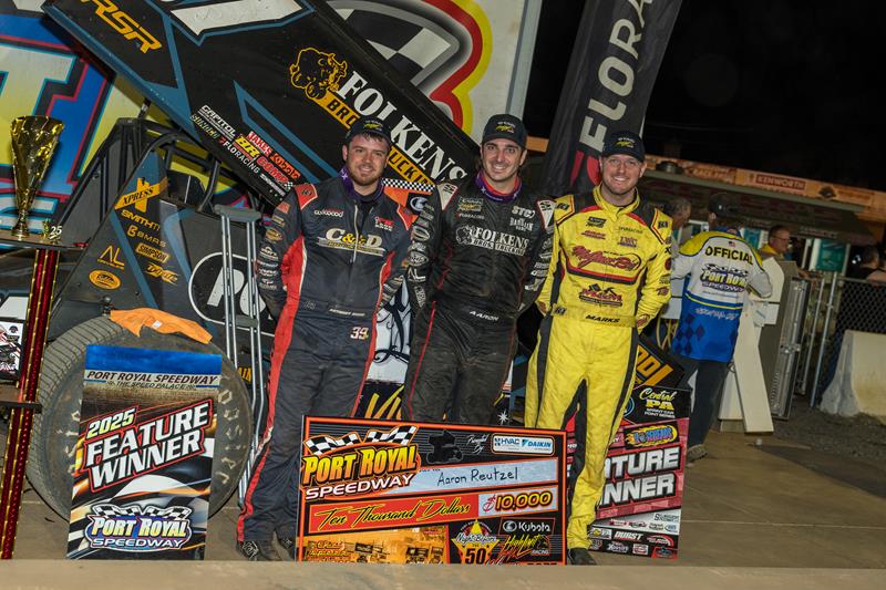 Port Royal, PA -- A broken leg at Eldora just over a month ago for Aaron Reutzel took him out of the seat of the Ridge & Son's Racing number 87 for an extended period. He returned to the seat of the car on Thursday night and made the A-main event. On Friday night, he would park his ride in Whiskey Meyers Kish Bank victory lane over a stout field of 52 sprint cars.