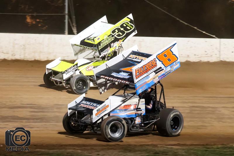 Racing his Papa’s Place Racing teammate wing-to-wing for numerous laps on the fresh clay of Weedsport, Paddock gathered grip to take the lead.