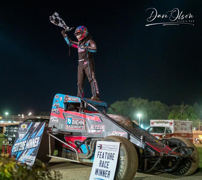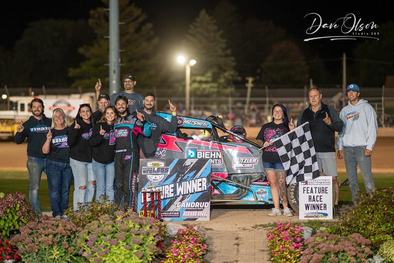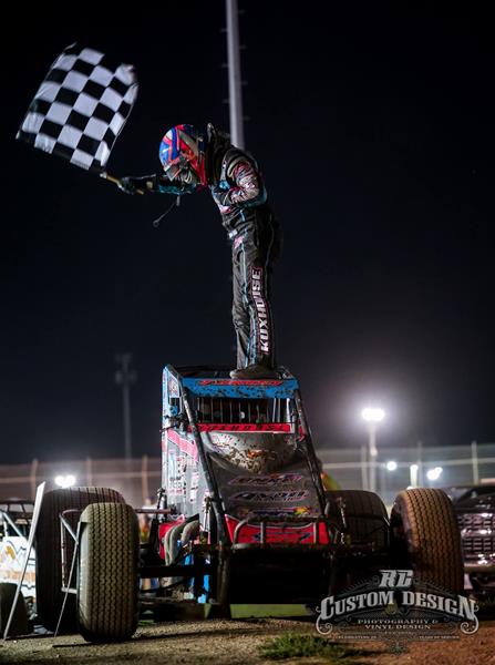 (Plymouth, Wis., Saturday, September 27, 2025)-- Tyler Kuxhouse of Antioch, IL gave his mother Darlene a special birthday present by taking top honors in the 20-lap AutoMeter powered by Gandrud Performance Wisconsin WingLESS Sprints season championship feature Saturday, September 27 at Plymouth Dirt Track, part of the Wisconsin Sprint Car Championships.