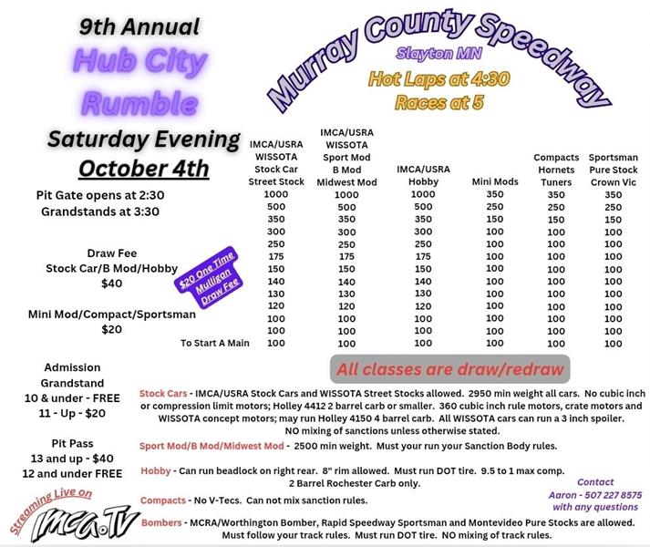 Here is the race info for Saturday, October 4th. This is always a fun race to end the season with. Message the track or Aaron with any questions. We look forward to seeing everyone one more time!