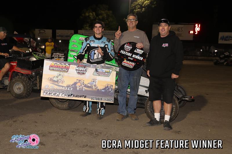 Braden Chiaramonte of El Cajon won the 30 lap BCRA/USAC Midget Main Event. Last season's Sprint Car Challenge Series runner-up Chiaramonte made his winning move with six laps to go and went on to collect the $2,000 victory.