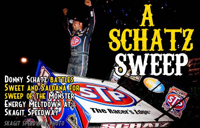 ALGER, Wash. - Aug. 30, 2014 - On the way to winning his fifth World of Outlaws STP Sprint Car Series feature in a row, Donny Schatz has had easier nights than Saturday's Monster Energy Meltdown at Skagit Speedway. After first fighting his way past Joey Saldana, he had to battle through lapped traffic and then hold off a hard charging Brad Sweet.
