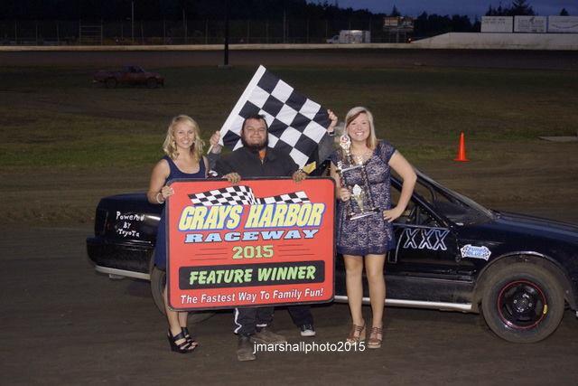 With every feature event this year going to Aberdeen's Willie Wright, he would look to try to make it five in a row. Cody Scouller of Woodland would lead the field down to the green flag, with Wishkah driver George Lovell in second, and Wright in third. Wright would move by Lovell to take over the second position, and set his sights on Scouller. Lovell would have his hands full as Don Briggs Sr. of Wishkah would look to take over the third spot, but could not make the pass. The first yellow flag of the 20 lap feature would come out on lap 2. Elisabeth Knox of Spanaway would get sideways, and clip the 9 of Dale Vacknitz in turn four, causing Vacknitz's bumper to come loose. Scouller would lead the field down to the green flag on the restart, with Wright, Lovell, and Briggs Sr in chase. Scouller would have tough company as Wright would get side by side with him in turn one. Ryan Onasch of Aberdeen would also join in on the battle for third with Briggs Sr, and Lovell, going up the middle to try to take the position. Scouller would continue to lead Wright, as Briggs Sr would be in chase of the leaders. The second yellow of the feature would come out on lap four, this time for a multiple car incident in turn three and four, with Onasch spinning, Dale Vacknitz Jr of Ocean Shores trying to avoid the incident, getting into the wall, as well as Knox getting collected, and Timmy Phillips of Spanaway would also make contact with the wall.