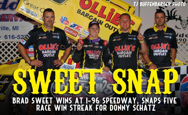 Sweet used a slide job in turns one and two on lap 29 to take the lead from Schatz and withstood a number of late restarts to win the NAPA Auto Parts Rumble in Michigan which marked his third win of the season and first since April. Sweet, who was the final of three leaders on Wednesday night, became the sixth different winner in the last five races for the World of Outlaws at I-96 Speedway.
