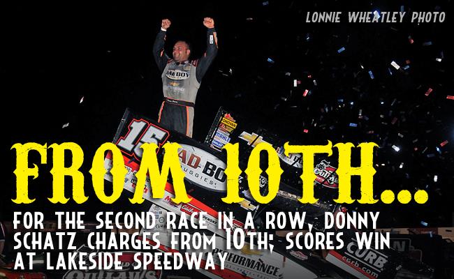KANSAS CITY, Kan. - July 1, 2015 - If Donny Schatz has a point to prove, it is that it does not matter where he starts, he will always be a threat to win. He certainly did that Wednesday night at the O'Reilly Auto Parts presents the Outlaws at Lakeside Speedway where, after charging forward from 10th, the six-time and reigning series champion battled past Joey Saldana in the closing laps of the feature to score his 18th World of Outlaws Sprint Car Series victory of the season.
