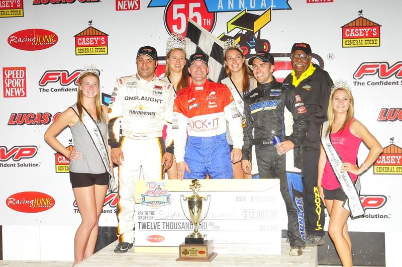 When Shane Stewart rolled into Knoxville on Sunday for the Capitani Classic, he walked away with a $5,000 payday and the goal of beating Donny Schatz. Fast Forward to Wednesday’s RacingJunk.com Qualifying Night, and the Bixby, Okla. shoe put his Jeff Gordon throwback / Kick-It No. 16 in Victory Lane just ahead of Donny; collecting a cool $12,000 payday in his 14th career Knoxville Raceway victory.