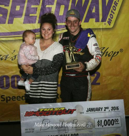 (Bill W) January 11, 2016 – Brady Bacon brought home his third Golden Driller from the Tulsa Shootout at the Tulsa Expo Center January 2. He was victorious in the Winged Outlaw micro class aboard Kelly and Terry Hinck’s #21H. He competed in four classes, qualifying for three main events. This Thursday, the Broken Arrow, Oklahoma driver will be attempting to win another Golden Driller when he qualifies for this week’s Chili Bowl.