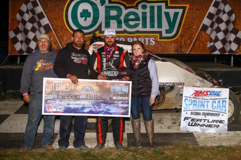 Some might consider putting the #1 on a racecar in the year following a championship as a well-earned honor. On the other hand, some might consider it a curse.Defending series champion Robert Ballou quickly put the latter notion to rest by leading all 30 laps in his Ballou Motorsports/MPHG Promotions - Blakesley's Auto/Maxim/Ott to win night two of "Winter Dirt Games VII" in Friday night's USAC AMSOIL Sprint Car National Championship feature at Bubba Raceway Park in Ocala, Florida.