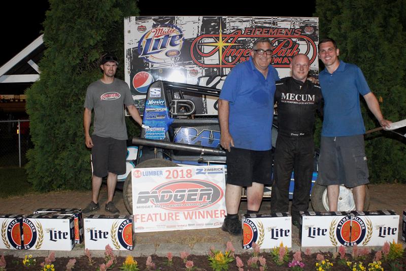 Sun Prairie, Wis., June 17--- Former Badger Midget Series Champion Davey Ray won the 20-lap Zimbrick Chevrolet of Sun Prairie Badger Midget Racing Series feature Sunday Night at Angell Park Speedway. The event was co-sanctioned with the POWRi Lucas Oil Regional Midget Series. The victory for Ray, was his first in a Badger sanctioned event since June 12, 2010.
