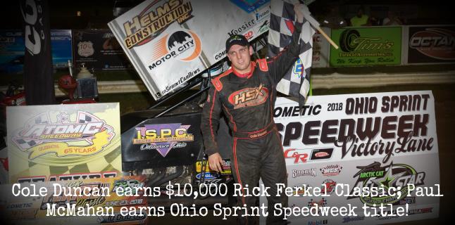 Cole Duncan won the battle, but Paul McMahan won the war, claiming the 36th Annual Cometic Gasket Ohio Sprint Speedweek presented by C&R Racing championship worth $3,000. McMahan’s Ohio Sprint Speedweek campaign included one victory - the Speedweek opener at Attica Raceway Park - as well as a grand total of six top-ten finishes in seven starts. Four of McMahan’s top-ten finishes were inside the top-five. The Speedweek title was the first of McMahan’s storied career.
