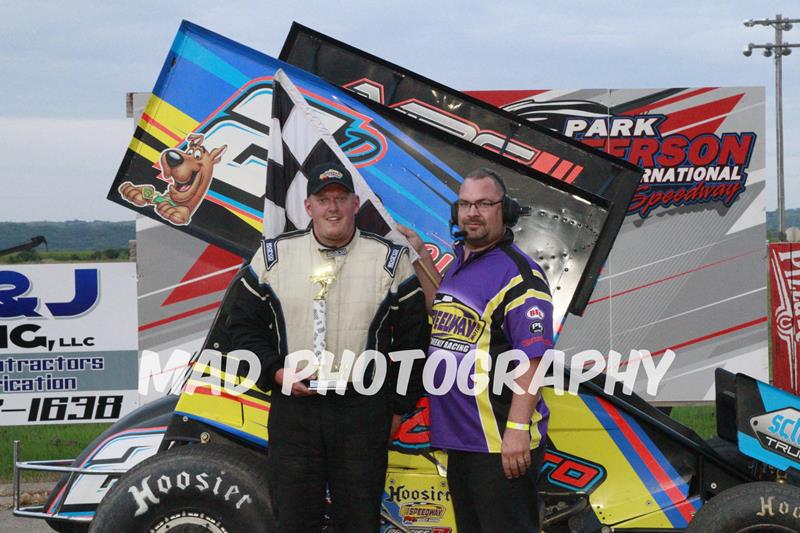 In the Artworks Graphics IMCA Modifieds, it was RJ Merchant who jumped to the early lead, however it was 10th place starting Jay Noteboom that was strapped into his rocket ship and powered his way to the front. Noteboom hooked the middle of the track and roared between the top 2 runners to take the lead and soon had a half straightaway lead and victory number 73 in his sights. However, a mechanical gremlin stopped the white seven machine high in turn 2, and Noteboom’s night and point lead were over. Chris Abelson used this to his advantage and came from 8th to quickly take the lead and win by 1.5 seconds over tough Bob Moore and Sean Barragan.