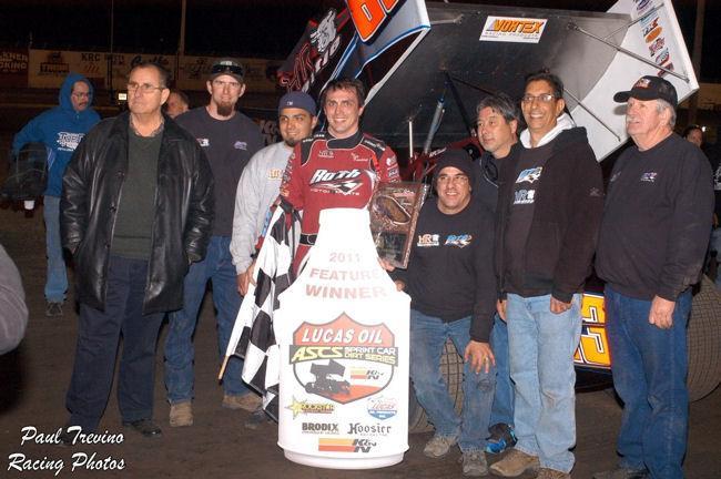 Tim Kaeding and Roth Motorsports pictured in victory lane on Wednesday at the Lucas Oil ASCS National opener in Tulare. Photo by Paul Trevino of http://www.paultrevinoracingphotos.com