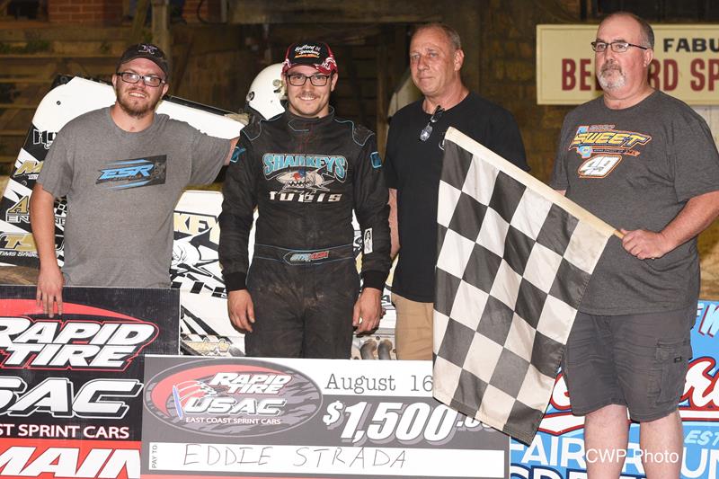 Eddie Strada of Lake Ariel, Pennsylvania was able to collect his first career win at the Bedford Speedway and his second win on the Rapid Tire, USAC East Coast Sprint Car series season.