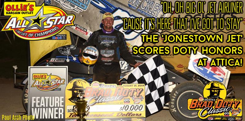 “This is badass,” Brock Zearfoss said in Attica Raceway Park victory lane, pilot of the Moose’s LZ Bar & Grill/Heavy Equipment, Loaders & Parts Inc./BAPS Auto Paint & Supply/Meckley's Limestone Products/Berkebile Oil Company/No. 70 sprint car. “I’ve been telling Brad (Doty) that I’ve wanted to come out to his race for the last three or four years, but this year we finally had the chance to do it. I’m just thankful Tony Stewart and the All Stars were able to put this deal together with Brad’s help. My guys, Shane and Tye, gave me an awesome race car the last two nights. What an honor to win this.”